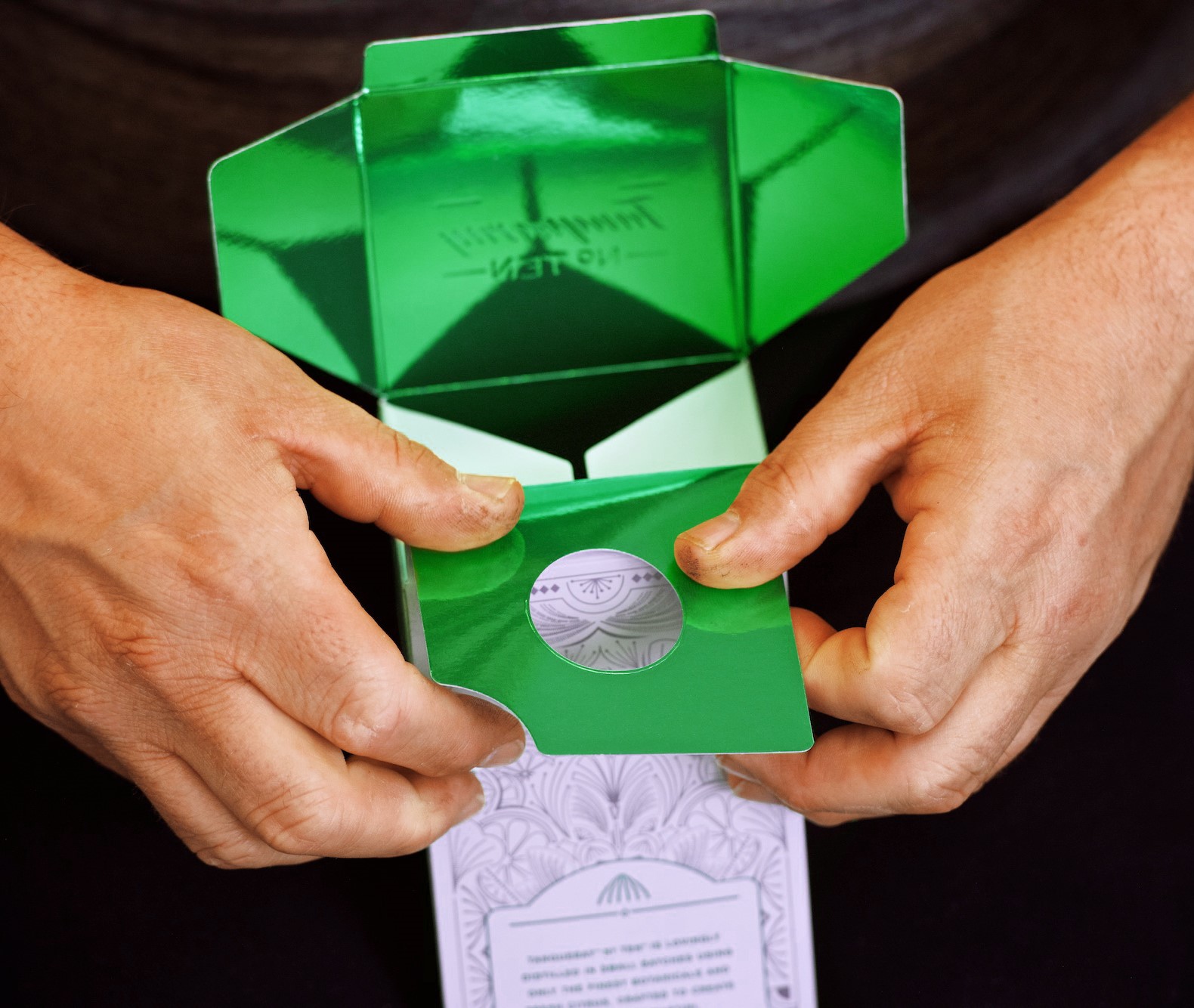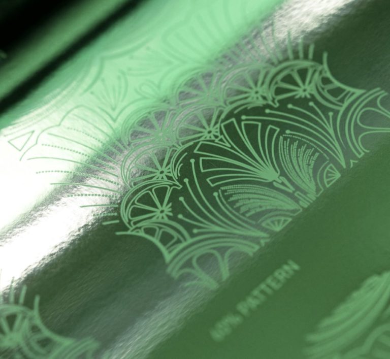 Washes of colour to produce a stunning foiled effect, a combination of sculpted embossing and a high build varnish, finished with a duplexed interior of a highly reflective green, made this an elaborate problem to solve.